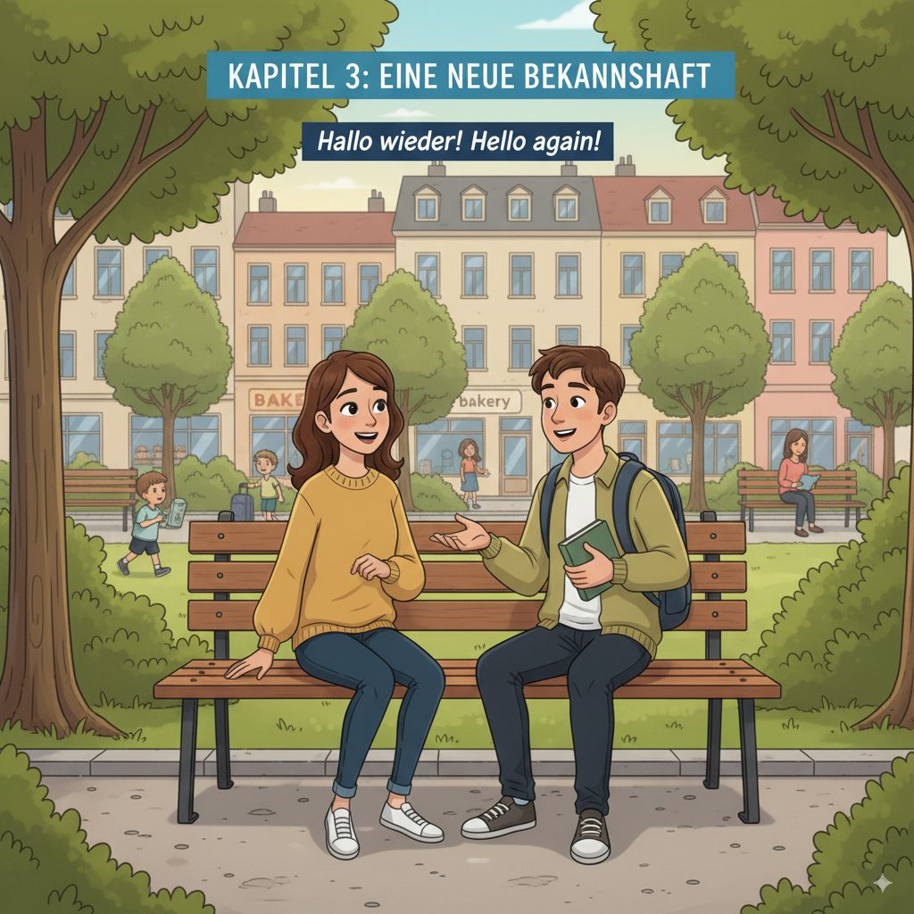 Nach ein paar Minuten (After a few minutes) kommt ein junger Mann in den Park. Er hat einen Rucksack (backpack) und sieht wie ein Student aus (looks like a student). Er setzt sich auf dieselbe Bank (the same bench) wie Anna, aber am anderen Ende (at the other end). Er holt ein Buch aus seinem Rucksack. Er schaut kurz zu Anna und lächelt. "Hallo!", sagt er. Seine Stimme ist freundlich. Anna lächelt zurück. "Hallo!", antwortet sie. Sie erinnert sich: "Hallo" ist informeller als "Guten Tag". Dieser Mann ist jung, vielleicht ist "Hallo" okay.